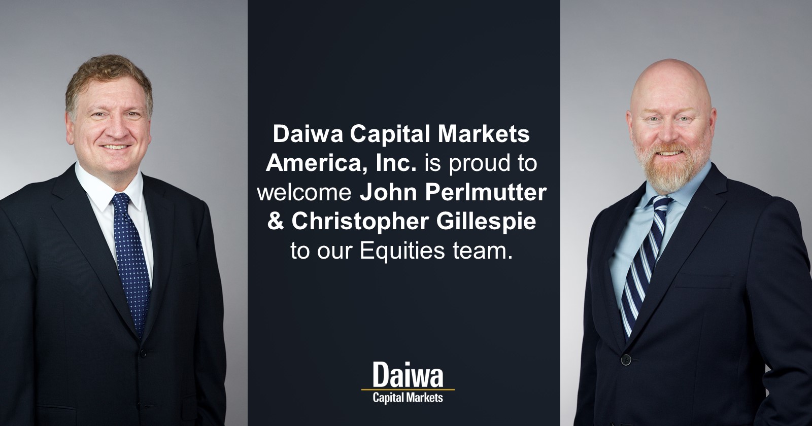 NEW YORK – January 8, 2026 – Daiwa Capital Markets America Inc. is pleased to announce the strategic expansion of its Equity Finance Department with the addition of two key industry veterans. John Perlmutter has joined Daiwa as an Executive Director to lead the firm’s revitalized Delta One strategies. Christopher Gillespie has joined as a Director on the firm’s Stock Finance desk to enhance Daiwa’s financing and hard-to-borrow capabilities.